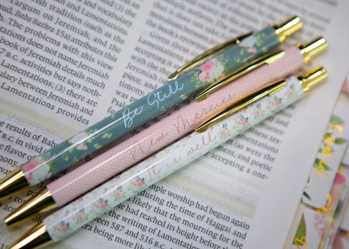 Write your reflections, prayers, and thoughts with a touch of style using our exquisite "Be Still" Christian Pen Set. Elegantly crafted to inspire, these fine-tip black gel ink pens glide smoothly across the pages of your bible, journal, church notes, or devotional, making them ideal companions for your faith journey. Elevate your writing during Bible studies with these beautiful pens!